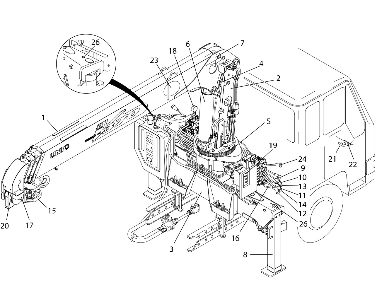 Cần cẩu thủy lực được lắp trên xe nhờ hệ thống quang cẩu, xiết chặt bệ cẩu với khung xát xi (chassis). Khoang lắp cẩu thường được gia cố thêm bằng cách lồng cạp thêm xát xi, thanh chống trong dầm xát xi, gia cường thêm cho dầm dọc của thùng xe. Trên mặt dầm xát xi thường hàn thêm các mố chặn, tránh hiện tượng xô cẩu khi phanh gấp hoặc tăng tốc quá nhanh (một chi tiết nhỏ, ít người để ý nhưng vô cùng quan trọng dưới góc độ kỹ thuật và an toàn sử dụng).