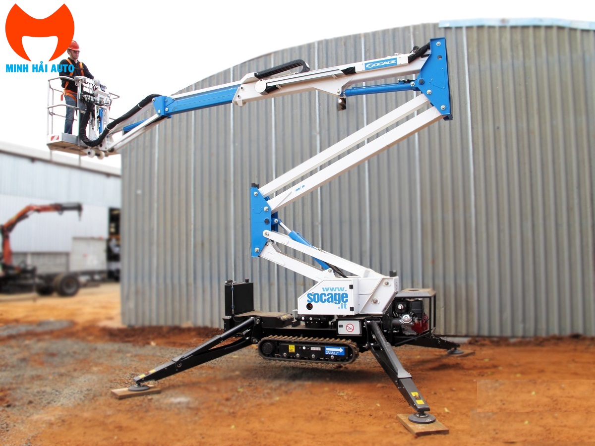 Xe nâng người Socage có chiều cao làm việc trải dài từ 12 đến 100m, trong đó xe nâng người chân nhện là một trong những thế mạnh của Socage. Xe nâng người chân nhện được xây dựng trên nền di chuyển thủy lực, di chuyển bằng 2 dải xích cao su, do đó áp lực lên nền đất thấp, xe cơ động cao dạng đa địa hình, linh hoạt và nhỏ gọn, Xe nâng người chân nhện dạng spider lift được thiết kế ra để đi đến mọi nơi làm việc, phù hợp công việc cả trong nhà lẫn ngoài trời. Với đặc tính gọn nhẹ, dễ sử dụng, xe nâng chân nhện còn thao tác nhanh, an toàn, giỏ nâng có thể tiếp cận đến mọi vị trí, không gian làm việc. Chiều cao làm việc của thiết bị từ 14m đến 52m và tầm với ngang có thể lên tới 20m, xe phục vụ đa dạng các công việc cho cả các công ty cho thuê chuyên nghiệp lẫn khách hàng sử dụng thiết bị trực tiếp.